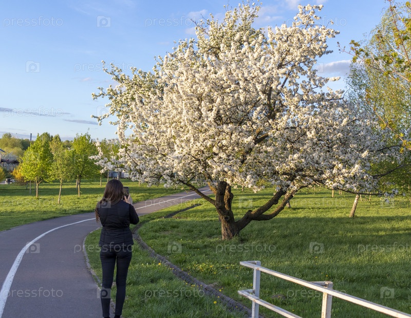 Женщина фотографирует цветущее фруктовое дерево в парке. Сезон