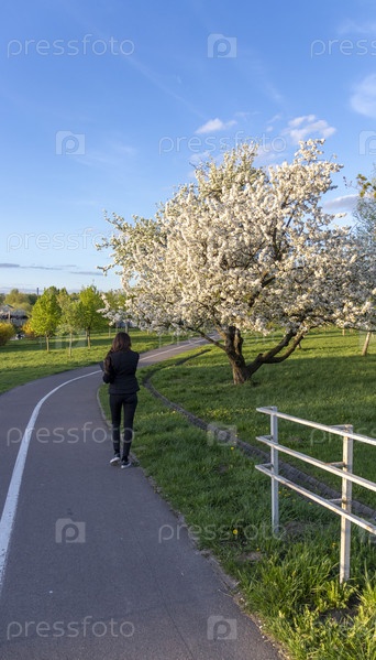 Женщина фотографирует цветущее фруктовое дерево в парке. Сезон