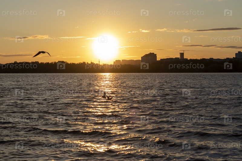 Солнце садится у воды и отражается в ней. Силуэт чаек. Природа