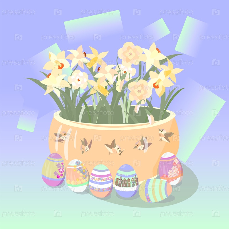 Пасхальная открытка с букетом нарциссов и пасхальными яйцами