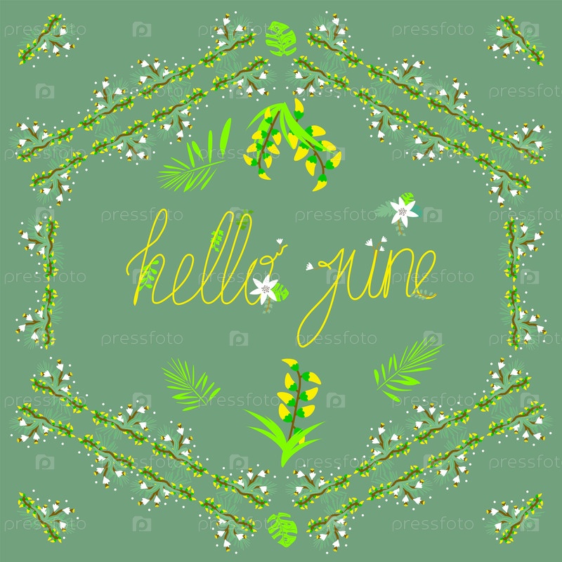 Привет июнь поздравительная открытка в рамке из желтых цветов и зеленых листьев на зеленом фоне