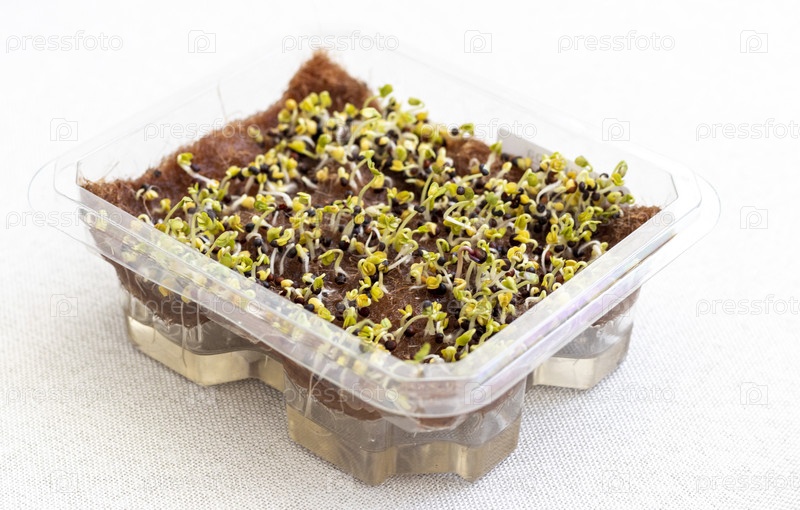 Свежепроросшие ростки микрозелени в пластиковом контейнере на джутовом коврике. Здоровое питание