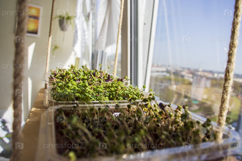 Свежие проросшие ростки микрозелени в пластиковых контейнерах на джутовом коврике. Размещены на деревянной полке на балконе современной квартиры. Образ жизни