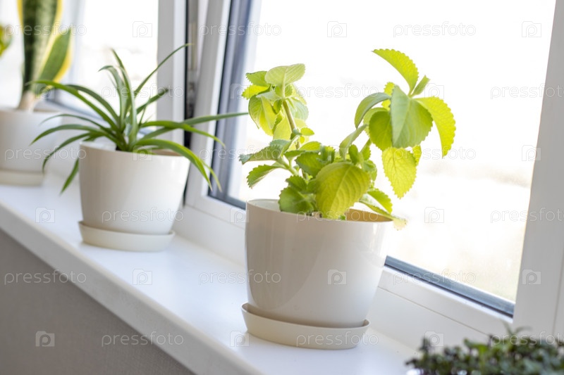 Эстетический снимок домашних растений в горшках на подоконнике современной квартиры. Интерьер