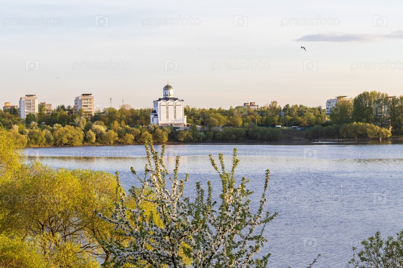 Солнце садится у озера, на заднем плане видны городские здания и церковь