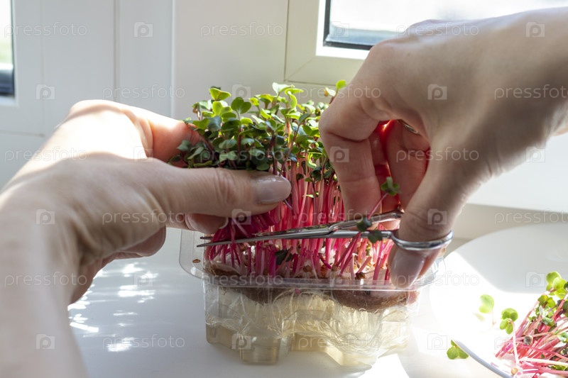 Женщина режет микрозелень в пластиковом контейнере. Растительная пища
