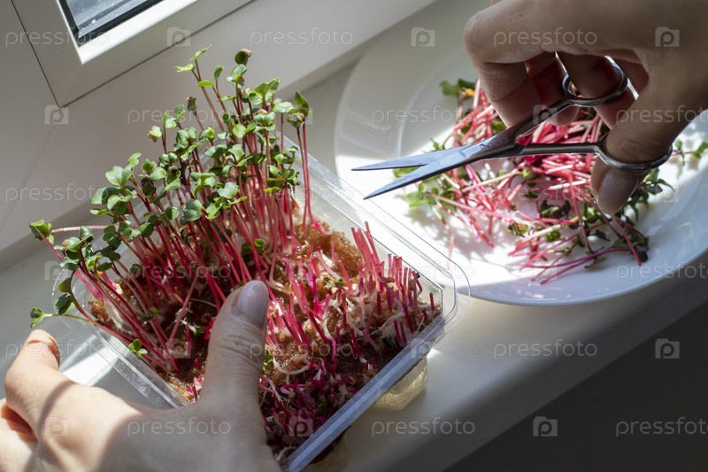 Женщина режет микрозелень в пластиковом контейнере. Растительная пища
