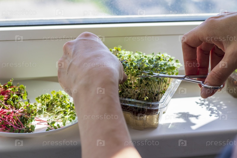 Женщина режет микрозелень в пластиковом контейнере. Здоровое питание