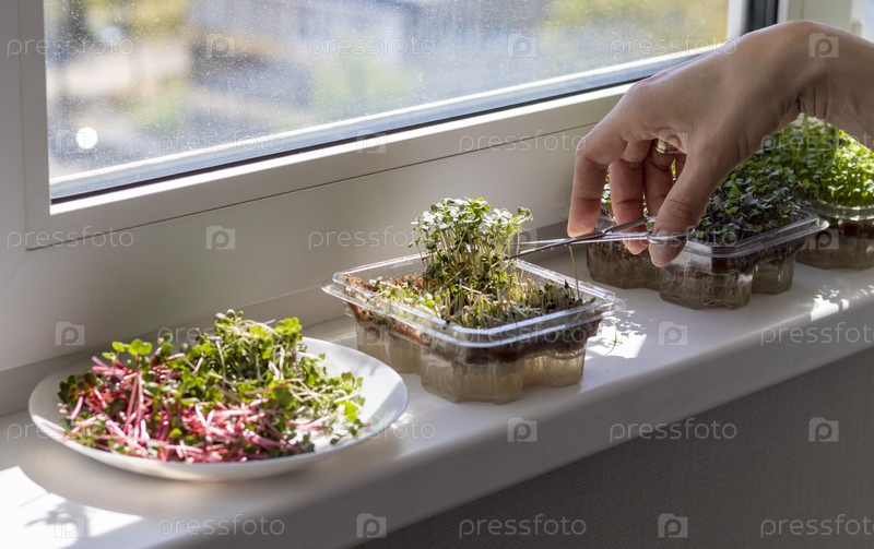 Женщина режет микрозелень в пластиковом контейнере. Здоровое питание