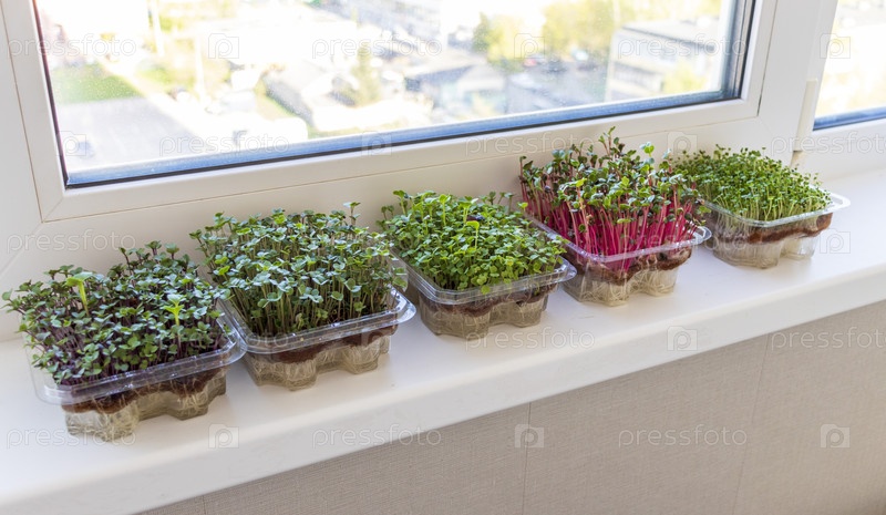 Свежие проросшие ростки микрозелени в пластиковых контейнерах на джутовом коврике. Размещены на подоконнике балкона современной квартиры. Образ жизни