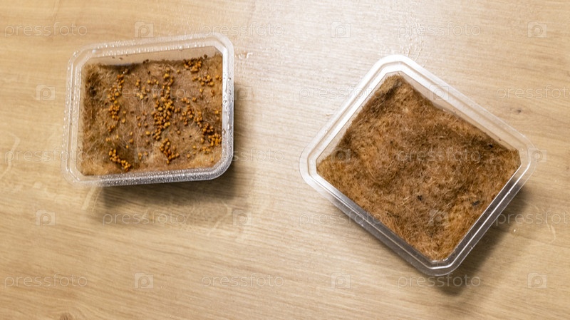 Пластиковые контейнеры, используемые для выращивания микрозелени с джутовым матом и поливом семян. Хобби
