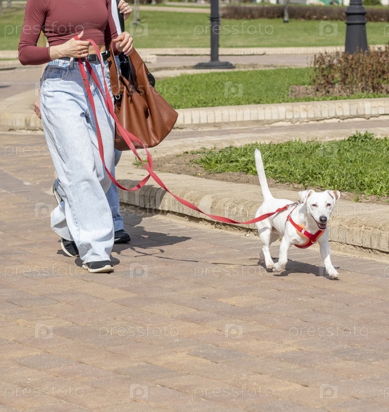 Молодая женщина выгуливает собаку в парке. Домашние животные