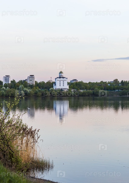 Солнце садится у озера с городскими зданиями и церковью на заднем плане, на открытом воздухе