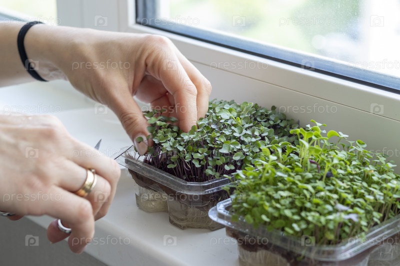 Женщина режет микрозелень в пластиковом контейнере. Здоровое питание