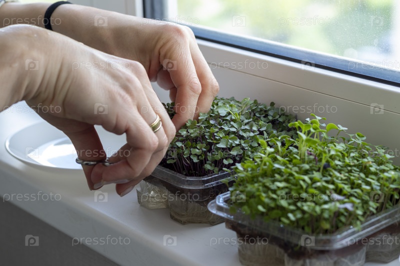 Женщина режет микрозелень в пластиковом контейнере. Здоровое питание