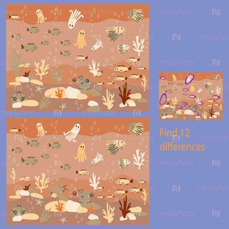Ребус для детей до 8 лет найди 12 отличий среди морских обитателей