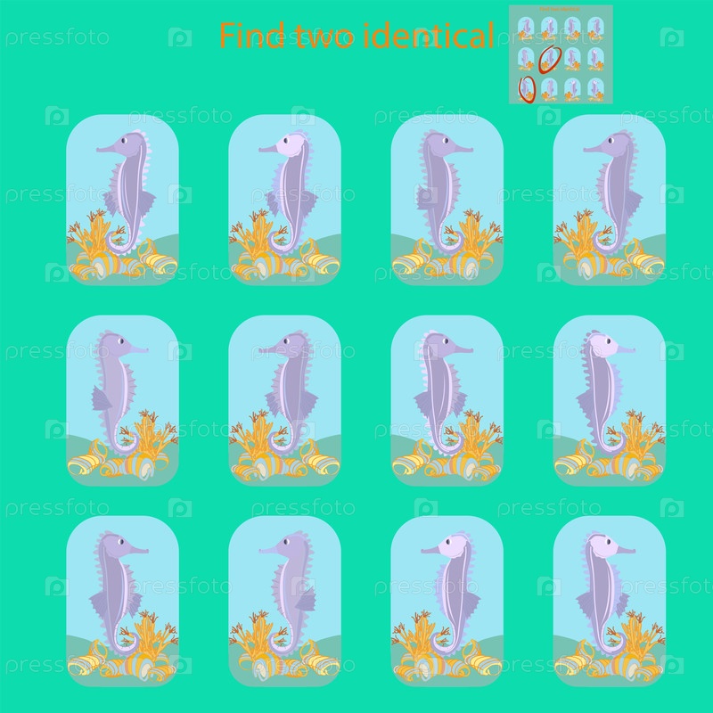 В ребусе для детей до 6 лет морские коньки, найдите два одинаковых