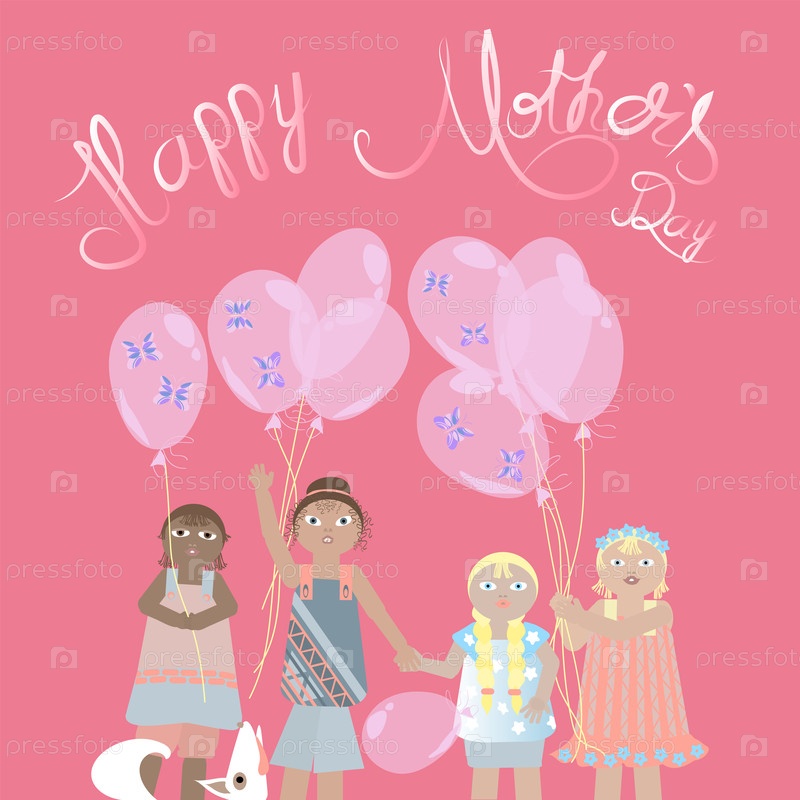 Открытка ко Дню матери с изображением детей и воздушных шаров