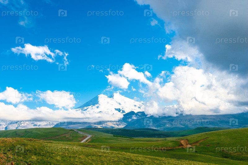 Живописный вид на вулкан Эльбрус, который скрывается в облаках. Приэльбрусье