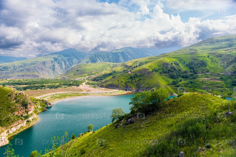 Живописный вид на горное озеро Гижгит с лазурной водой. Кавказ