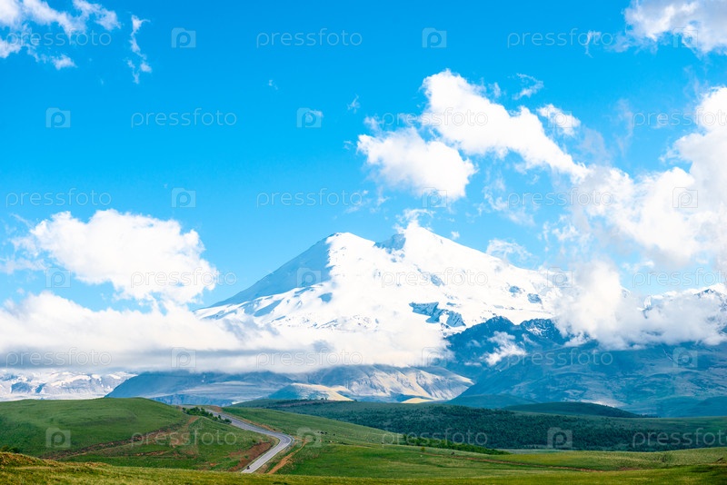 Живописный вид на вулкан Эльбрус, который скрывается в облаках. Приэльбрусье