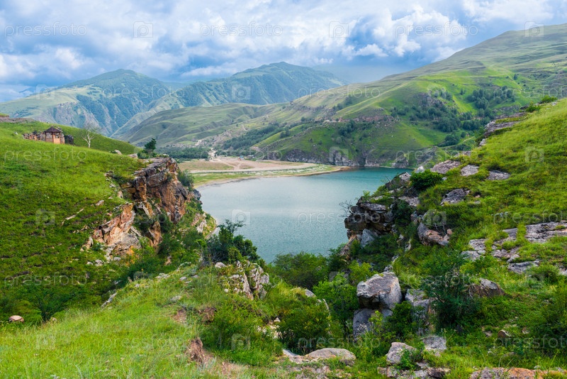 Живописный вид с крутых скал на горное озеро Гижгит с лазурной водой. Кавказ