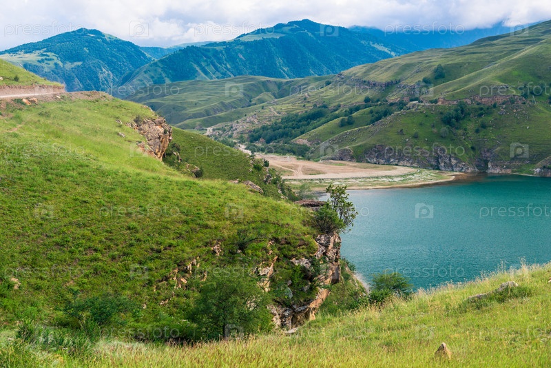 Живописный вид на горное озеро Гижгит с лазурной водой. Кавказ