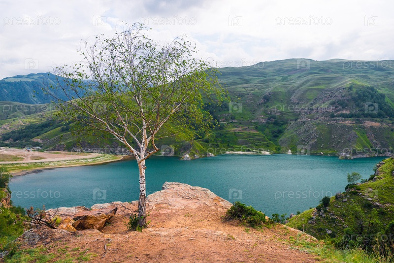 Живописный вид на горное озеро Гижгит с лазурной водой и одиноким деревом на берегу. Кавказ