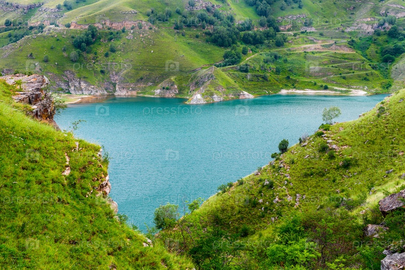 Живописный вид на горное озеро Гижгит в форме сердца с лазурной водой. Кавказ