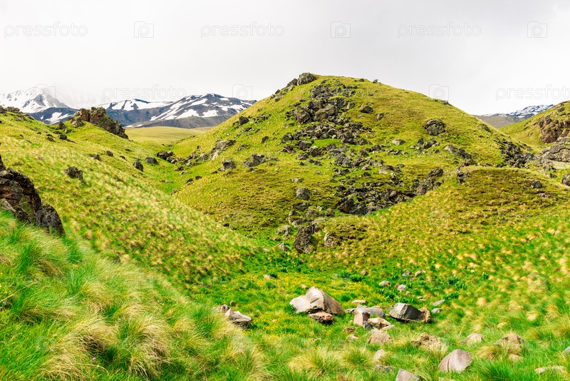 Таинственный пейзаж с зелеными горами и скалами близ долины Эммануэль и Приэльбрусья