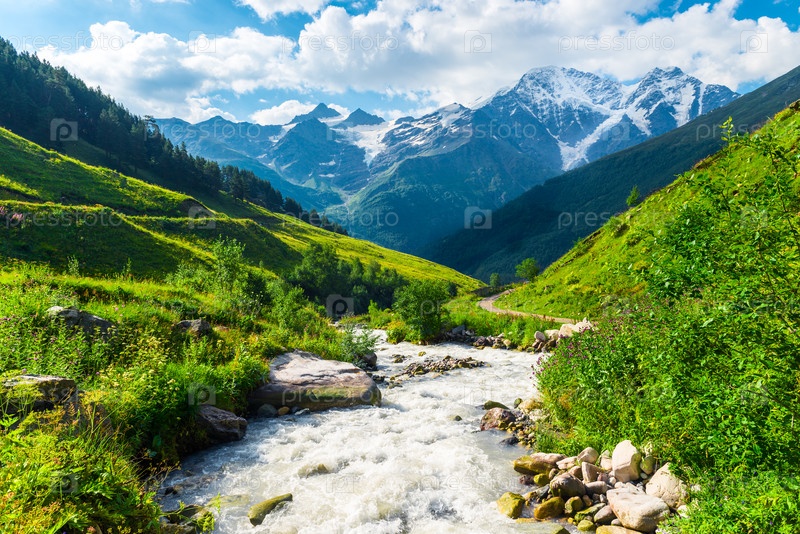 Красивый горный пейзаж в долине бурной чистой реки Терскол с видом на ледник 'Север'