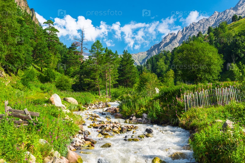 Красивый горный пейзаж в долине бурной чистой реки Терскол. Кавказ, Приэльбрусье