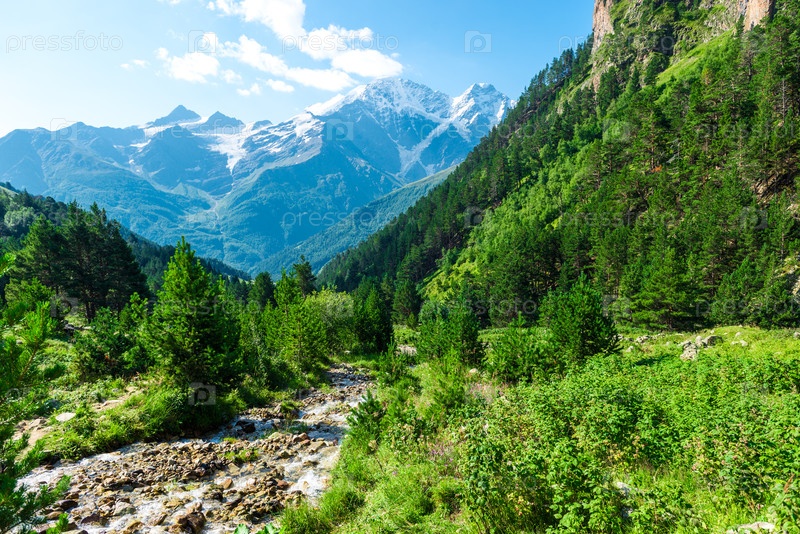 Красивый горный пейзаж в долине бурной чистой реки Терскол с видом на ледник «Севен». Кавказ, Приэльбрусье