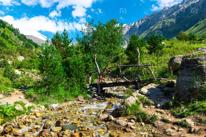 Красивый горный пейзаж с деревянным мостом через чистую горную реку. Кавказ, Приэльбрусье