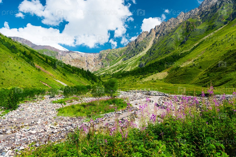 Живописный горный пейзаж долины горной реки Терскол. Кавказ, Приэльбрусье