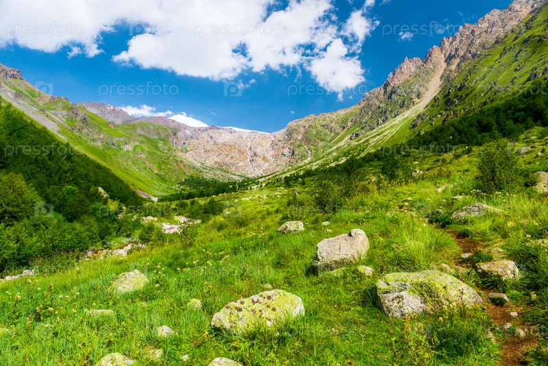 Красивый высокогорный пейзаж с зелеными склонами и большими камнями. Кавказ, Приэльбрусье
