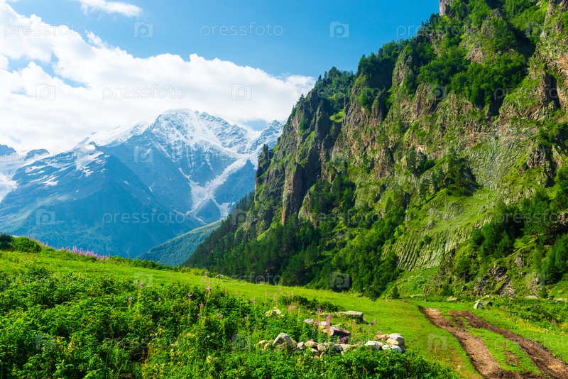 Красивый горный пейзаж в долине бурной чистой реки Терскол с видом на ледник 'Север'
