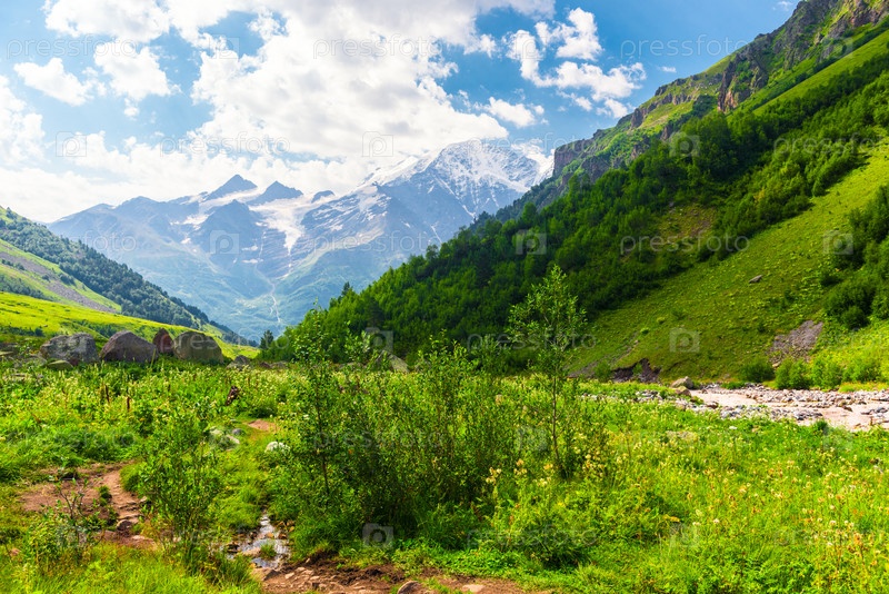 Красивый высокогорный пейзаж с зелеными склонами и большими камнями. Кавказ, Приэльбрусье