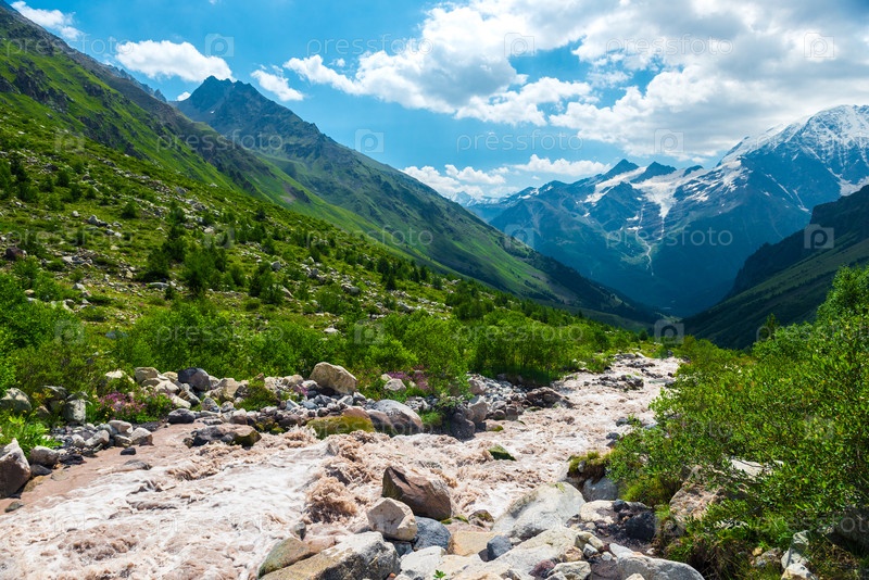 Бурный грязный поток каменистой горной реки высоко в горах. Кавказ, Приэльбрусье