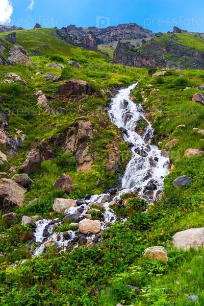Каменистый зеленый склон с бурным белым потоком пресной горной реки. Кавказ, Приэльбрусье
