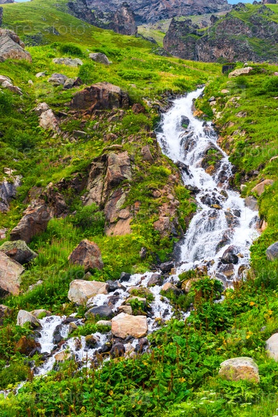 Каменистый зеленый склон с бурным белым потоком пресной горной реки. Кавказ, Приэльбрусье