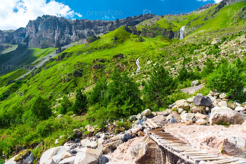 Старый, хлипкий деревянный мост через бурную, полноводную горную реку с быстрым течением. Кавказ, Приэльбрусье