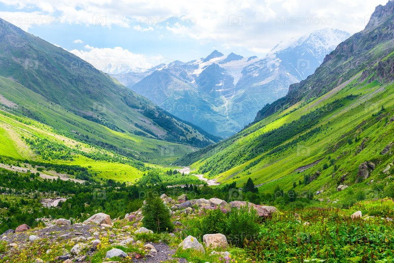 Красивый высокогорный пейзаж с зелеными склонами и большими камнями. Кавказ, Приэльбрусье