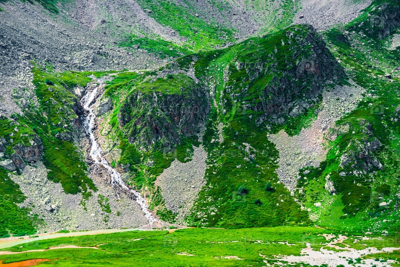 Живописный горный водопад в суровой скалистой местности. Кавказ