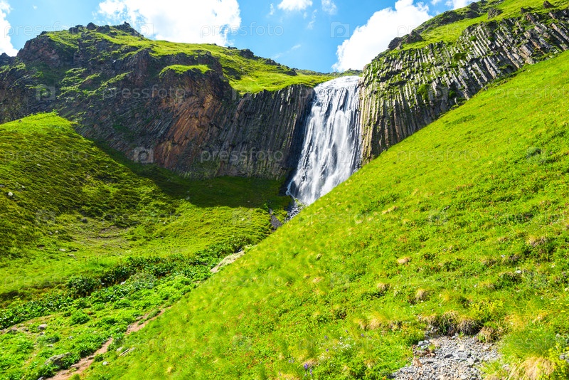 Красивый водопад Терскол падает с базальтовой стены и окружен зелеными склонами. Кавказ, Приэльбрусье