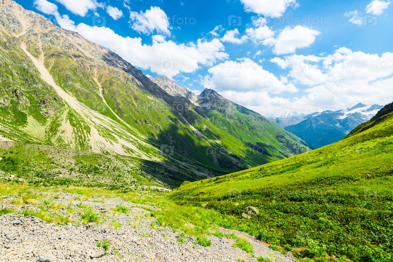 Красивый высокогорный пейзаж с зелеными склонами и большими камнями. Кавказ, Приэльбрусье