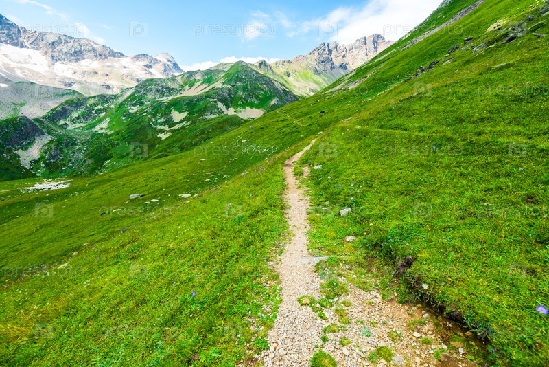 Красивый вид с пешеходной тропы на склоне горы высоко в Кавказских горах