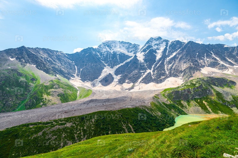 Красивый горный пейзаж с видом на ледник 'семь' и горное озеро.Кавказские горы