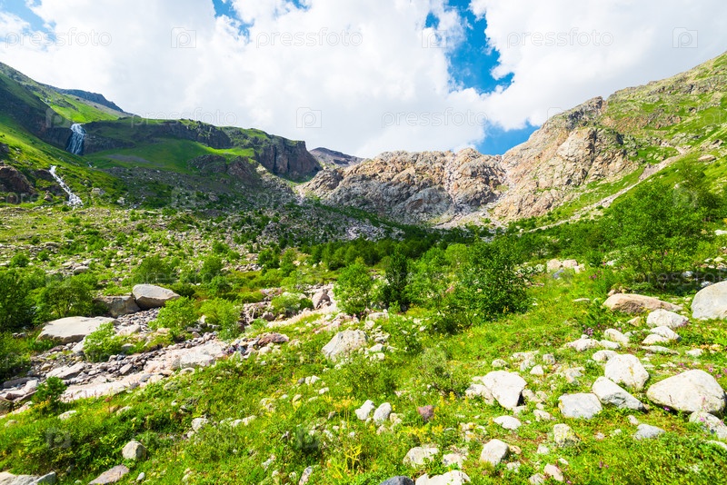 Красивый высокогорный пейзаж с зелеными склонами и большими камнями. Кавказ, Приэльбрусье