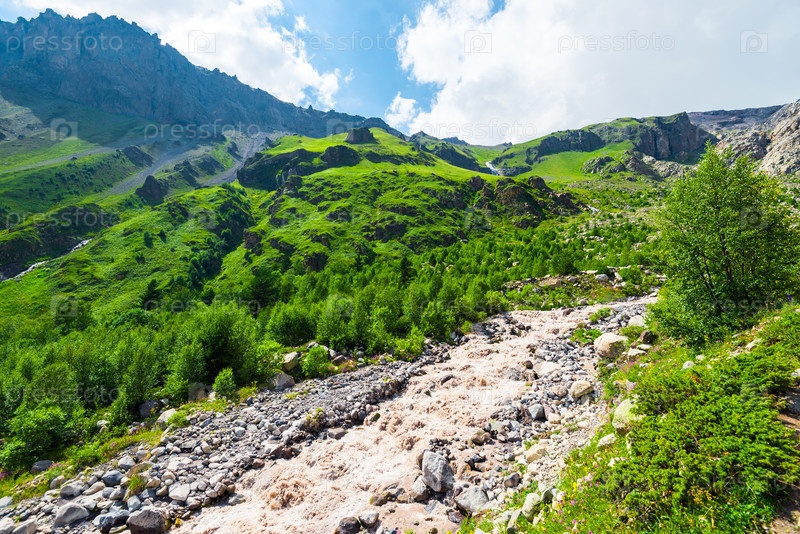 Живописный горный пейзаж долины горной реки Терскол. Кавказ, Приэльбрусье